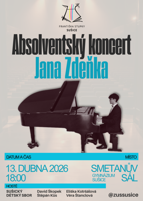 První letošní absolventský koncert bude mít tentokrát jediného protagonistu – talentovaného klavíristu Jana Zdeňka, který tímto završí své studium na ZUŠ Františka Stupky v Sušici.