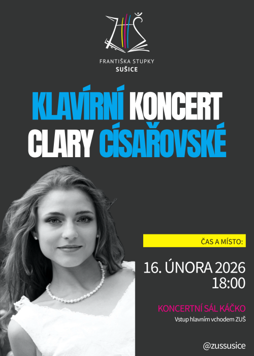 16. února v 18:00 se v koncertním sále Káčko představí klavírní virtuoska a naše vyučující hry na klavír Clara Císařovská. Posluchači se mohou těšit na vrcholná díla klasické a romantické klavírní literatury od Ludwiga van Beethovena, představitelů ruské národní hudby Milije Balakireva, Sergeje Rachmaninova a Petra Iljiče Čajkovského, stejně jako na temperamentní Španělskou rapsodii Ference Liszta. Program slibuje večer plný nespoutané energie, strhující virtuozity a dramatického napětí, v němž klavír zazní v celé své síle a výrazové šíři.