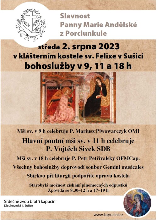 Ve středu 2. srpna 2023 se můžete zúčastnit liturgie (v 9, v 11 a v 18 h) spojené s oslavou Panny Marie Andělské z Porciunkule. První bohoslužbu bude celebrovat horažďovický farář P. Mariusz Piwowarczyk OMI; v 11 h uvítáme salesiánského kněze P. Vojtěcha Sivka; večerní mši svaté bude předsedat místní kapucín br. Petr Petřivalský. Všechny bohoslužby hudebně doprovodí soubor Gemini musicales z Kladna.