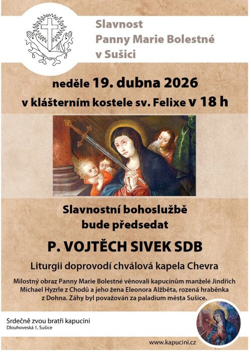 V neděli 19. dubna 2026 máme v klášterním kostele sv. Felixe slavnost Panny Marie Bolestné. Obvykle se připomínka sedmi bolestí Panny Marie liturgicky slaví v září, v Sušici je to však zvykem o třetí neděli velikonoční. Budeme rádi, když zavítáte na mši sv. v 18 h.